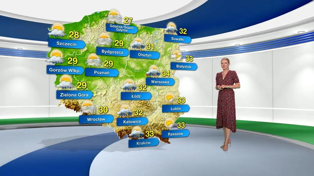 Temperatura maksymalna wyniesie od 27-28 stopni Celsjusza w rejonie Pomorza Zachodniego do 33-34 st. C na wschodzie Polski. Powieje słaby i umiarkowany, okresami silniejszy wiatr, z kierunków południowych, skręcający na południowo-zachodni.
