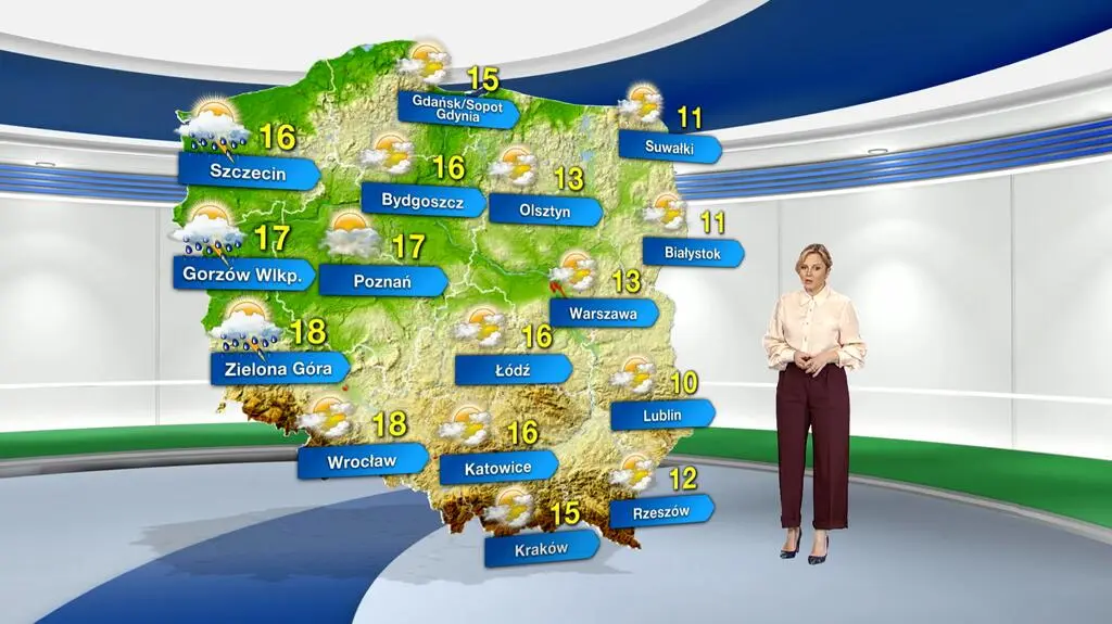 W piątek zachmurzenie będzie małe i umiarkowane. Jednak w godzinach 15-16 ilość chmur na zachodnich krańcach kraju wzrośnie i spadnie przelotny deszcz do trzech litrów wody na metr kwadratowy. Niewykluczone są też słabe burze z opadem deszczu rzędu 5-15 litrów wody na metr kwadratowy i porywami wiatru 50-70 kilometrów na godzinę. Temperatura w najcieplejszym momencie dnia wyniesie od 10 stopni Celsjusza na Lubelszczyźnie, przez 11 st. C na Podlasiu, do 18 st. C na Dolnym Śląsku i Wzniesieniach Zielonogórskich. Powieje słaby i umiarkowany wiatr z południa, na Wybrzeżu okresami silniejszy.