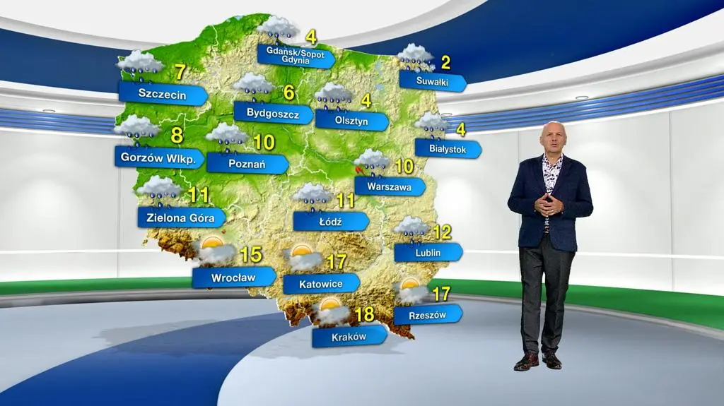 Po porannych licznych mgłach, które będą ograniczać widzialność do 100-200 metrów, w ciągu dnia na przeważającym obszarze Polski będzie pochmurno i pojawią się opady deszczu i mżawki, a na Suwalszczyźnie spadnie również deszcz ze śniegiem. W południowych regionach, gdzie nie powinno padać, możliwe są przejaśnienia i lokalne rozpogodzenia.