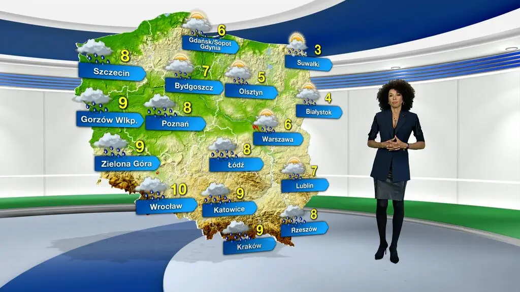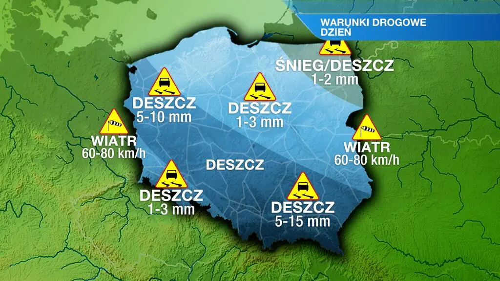 W poniedziałek wystąpi duże zachmurzenie z opadami deszczu o sumie 1-15 litrów na metr kwadratowy. Na Suwalszczyźnie i Mazurach może popadać deszcz ze śniegiem. Temperatura maksymalna wyniesie od 3 stopni Celsjusza na Suwalszczyźnie do 10 st. C na Dolnym Śląsku. Powieje umiarkowany i dość silny wiatr z zachodu, który okresami w porywach osiągnie 60-80 kilometrów na godzinę. W strefie brzegowej prognozuje się porywy przekraczające 80 km/h.