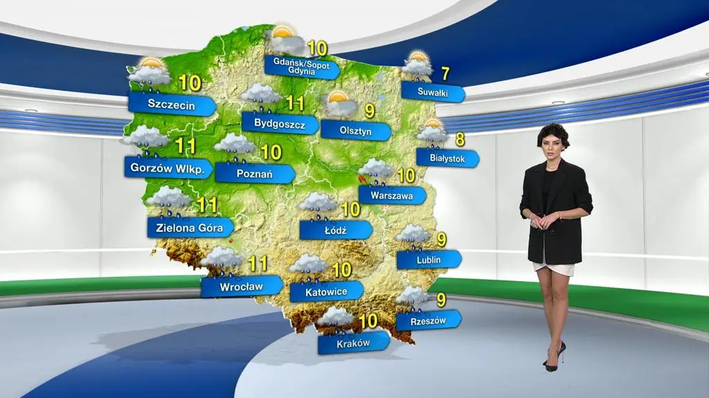 Dzień zapowiada się pochmurno z większymi przejaśnieniami na Kaszubach, Warmii i Podlasiu. W niektórych miejscach pojawią się słabe opady deszczu lub mżawki rzędu 1-3 l/mkw., na ogół bez opadów powinno być tylko w rejonie Kaszub i Warmii. Na termometrach zobaczymy maksymalnie od 7 st. C na Suwalszczyźnie, przez 10 st. C w centrum kraju, do 11 st. C na Kujawach, Ziemi Lubuskiej i Dolnym Śląsku.
