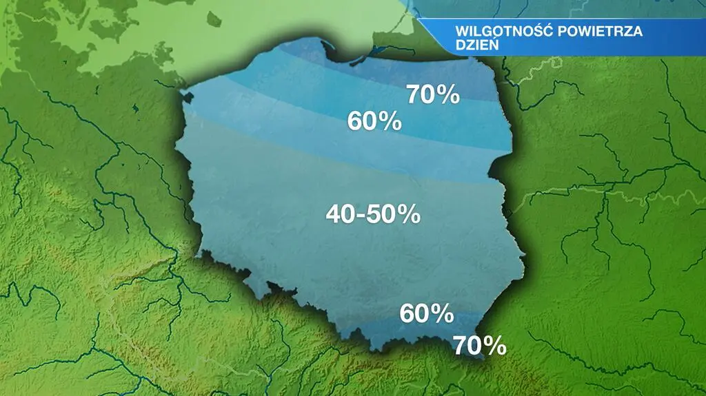 Największą wilgotność w środę odnotujemy na północnym i południowym wschodzie, sięgnie do około 70 procent. Na pozostałym obszarze utrzyma się w granicach 40-50 procent.
