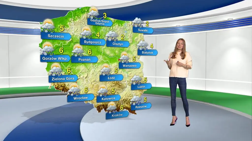Zachmurzenie duże z przejaśnieniami, przelotny deszcz ze śniegiem. Termometry pokażą maksymalnie do 6 st. C. Powieje północno-zachodni umiarkowany, okresami dość silny wiatr, w porywach do 50 km/h. Ciśnienie rośnie, w południe osiągnie 998 hPa.