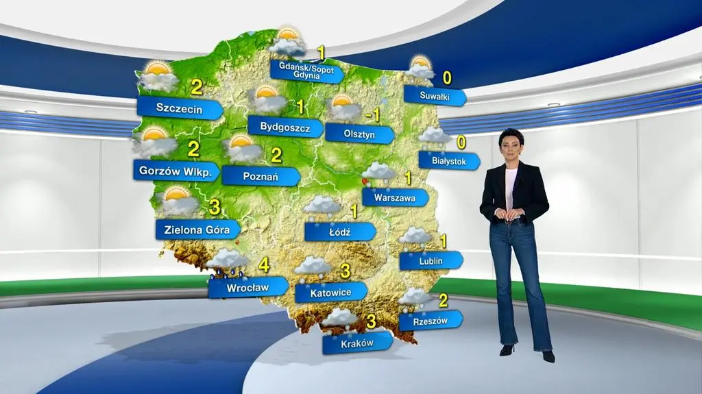 Noc zapowiada się pochmurno z opadami śniegu, deszczu ze śniegiem i deszczu. W niektórych miejscach pojawią się mgły ograniczające widzialność do poniżej 100 metrów. Temperatura minimalna wyniesie od -2 stopni Celsjusza na Suwalszczyźnie do 3 st. C na Dolnym Śląsku. Wiatr będzie słaby i umiarkowany, północno wschodni.