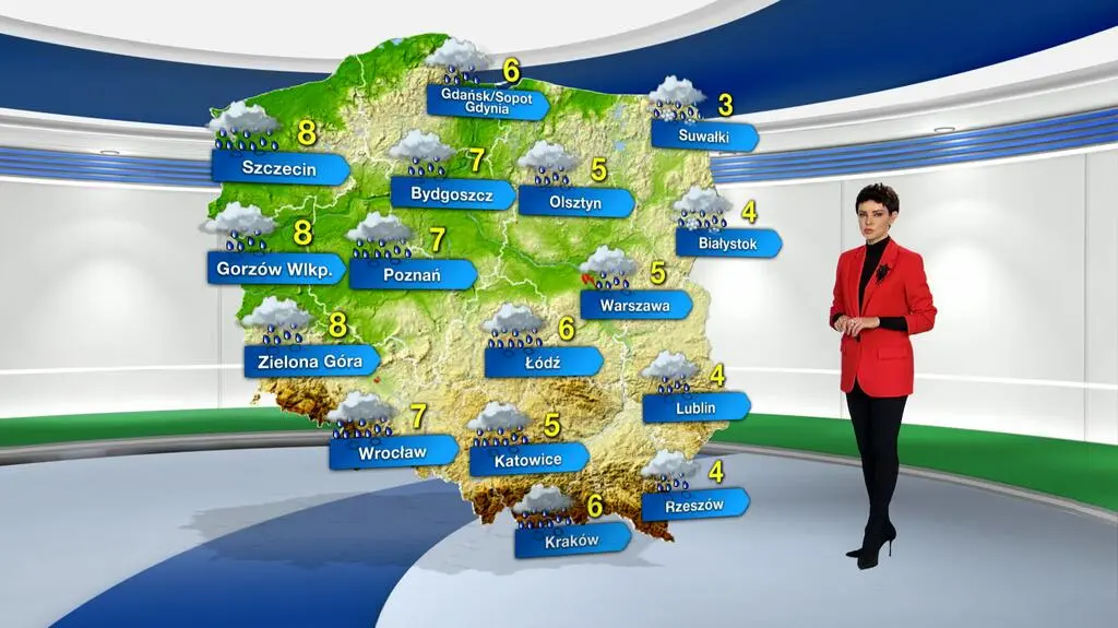 W nocy będzie pochmurno z niewielkimi rozpogodzeniami oraz przelotnymi opadami deszczu rzędu 2-10 litrów na metr kwadratowy. Na północnym wschodzie kraju popada również deszcz ze śniegiem. Temperatura minimalna wyniesie od 1-2 stopni Celsjusza na Suwalszczyźnie do 3-4 st. C na Dolnym Śląsku. Wiatr będzie umiarkowany, w porywach dość silny, osiągający prędkość 40-60 kilometrów na godzinę, południowo-zachodni.