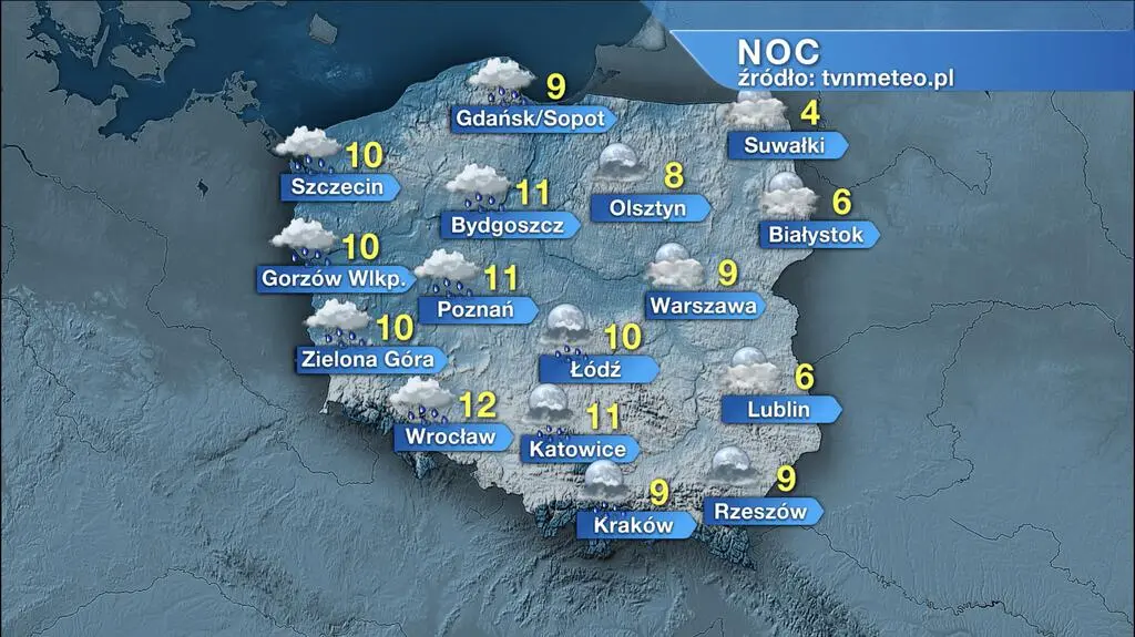 W nocy będzie pochmurno z opadami deszczu rzędu 2-10 litrów na metr kwadratowy na zachodzie kraju. Częściowo w centrum również popada, ale słabiej, do 1-2 l/mkw. Dość pogodnie będzie jedynie we wschodnich regionach.