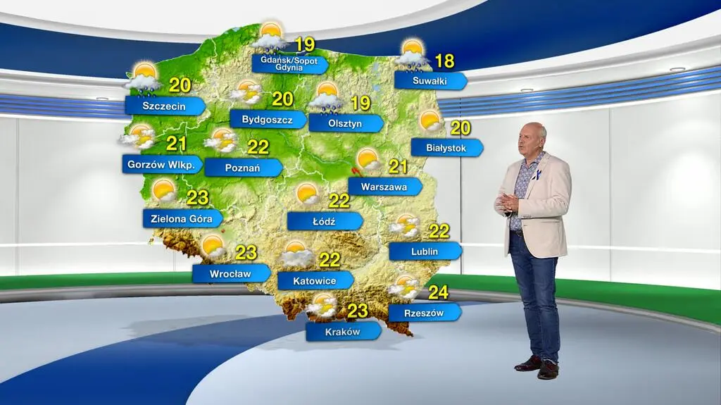 Nocą w pasie dzielnic południowych pojawią się przelotne opady deszczu oraz burze z opadami rzędu 10-20 litrów wody i porywami wiatru do 60-80 kilometrów na godzinę. W pozostałych regionach będzie pogodnie. Temperatura minimalna wyniesie od 9 stopni Celsjusza na Nizinie Szczecińskiej do 14 st. C na Podkarpaciu. Wiatr będzie słaby i umiarkowany, na wybrzeżu okresami silniejszy, zachodni.