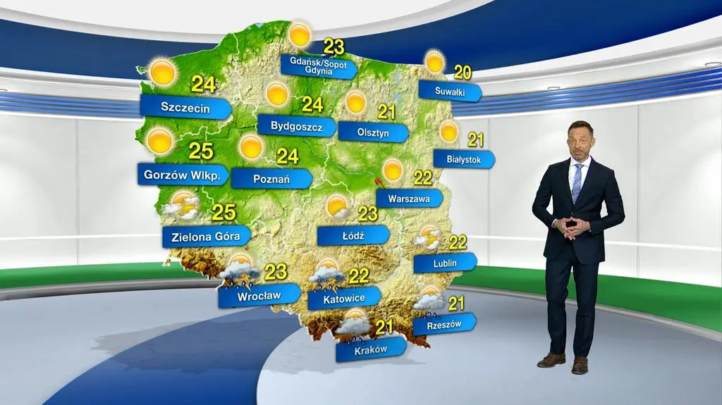 Dzień zacznie się słonecznie. Potem w południowych regionach wzrośnie zachmurzenie i pojawią się opady deszczu do 5 litów na metr kwadratowy oraz burze. Podczas wyładowań atmosferycznych spadnie 10-20 l/mkw. deszczu, a wiatr w porywach rozpędzi się do 60-80 km/h. Termometry pokażą maksymalnie od 20 st. C na Suwalszczyźnie do 25 st. C w rejonie Ziemi Lubuskiej. Wiatr, nadciagający ze wschodu, powieje umiarkowanie, okresami silniej.