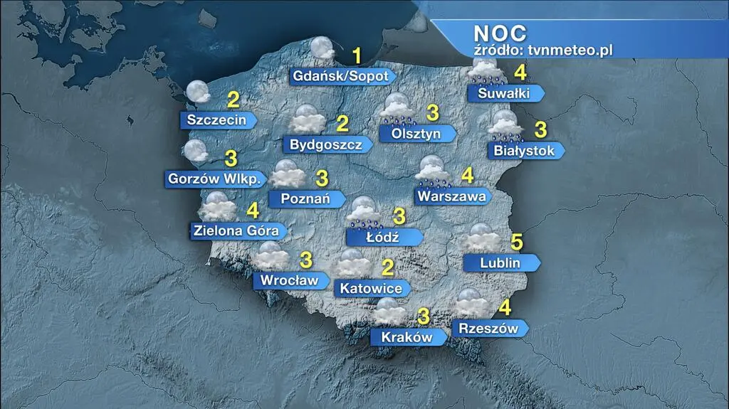Noc przyniesie duże zachmurzenie z rozpogodzeniami. Początkowo, lokalnie na Warmii i Mazurach oraz w centrum kraju, wystąpią zanikające przelotne opady deszczu. W drugiej części nocy pojawią się silne zamglenia, lokalnie także gęste mgły ograniczające widzialność do 200-600 metrów, zwłaszcza w pasie od Dolnego Śląska po Suwalszczyznę. Temperatura minimalna wyniesie od 1-2 stopni Celsjusza na północnym zachodzie do 4-5 st. C na południowym wschodzie. Wiatr będzie słaby, zmienny.