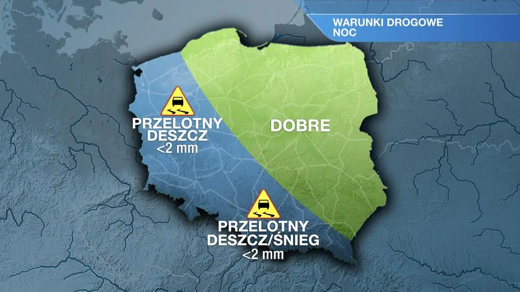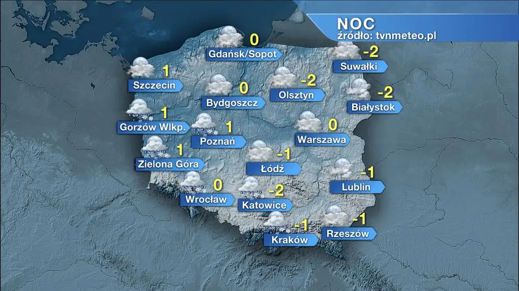 Pogoda na noc. Prognozowane jest umiarkowane zachmurzenie z rozpogodzeniami. Początkowo mogą pojawić się zanikające, przelotne opady deszczu. Miejscami może jednak padać deszcz ze śniegiem (zwłaszcza na południu Polski), a w górach - śnieg do 2-4 centymetrów. Na termometrach zobaczymy od -2/-1 stopnia Celsjusza na wschodzie do 0/1 st. C na zachodzie kraju. Wiatr będzie słaby i umiarkowany, zachodni.
