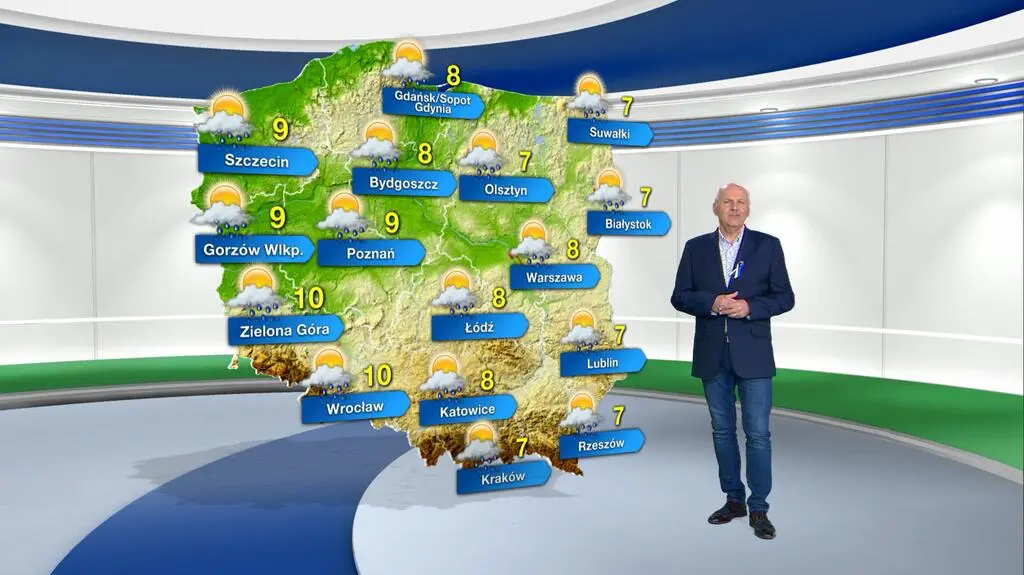 W poniedziałek prognozowane jest początkowo umiarkowane, a później duże zachmurzenie z przelotnymi opadami deszczu. Lokalnie pojawią się opady deszczu ze śniegiem i krupy śnieżnej, zwłaszcza na obszarach podgórskich, w górach oraz na północy kraju. Termometry w najcieplejszym momencie dnia pokażą od 7/8 st. C w rejonie Suwałk, Lublina, Rzeszowa do 9/10 st. C w Szczecinie i Wrocławiu. Wiatr będzie umiarkowany, w porywach dość silny, rozpędzając się do 30-50 kilometrów na godzinę. Powieje z zachodu i północnego zachodu.