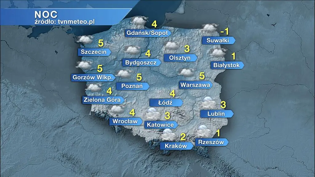 Noc w przeważającej części kraju upłynie z pochmurnym niebem, miejscami możliwe są słabe opady mżawki. Przejściowe rozpogodzenia pojawią się jedynie na południu Polski i tam należy spodziewać się mgieł ograniczających widzialność do 100-200 metrów.