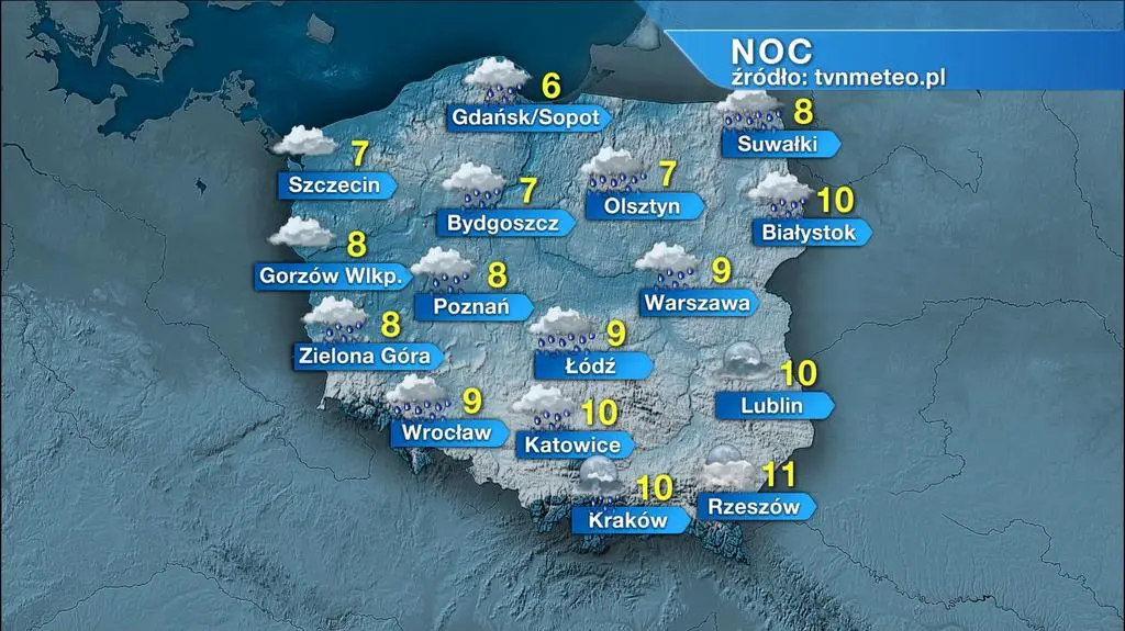 Nocą na przeważającym obszarze kraju wystąpi zachmurzenie. Towarzyszyć mu będą słabe opady deszczu na zachodzie, których suma wyniesie 1-2 litry na metr kwadratowy oraz umiarkowane (przejściowo intensywne) w pasie od Dolnego Śląska po Suwalszczyznę - tu spadnie do 10-15 l/mkw. Nad ranem na zachodzie prognozowane są silne zamglenia, lokalnie mgły ograniczające widzialność do 200-600 metrów. Temperatura minimalna wyniesie od 6-7 stopni Celsjusza na Pomorzu, przez 8-9 st. C w centrum, do 10-11 st. C na Podkarpaciu. Powieje wiatr słaby, zmienny.