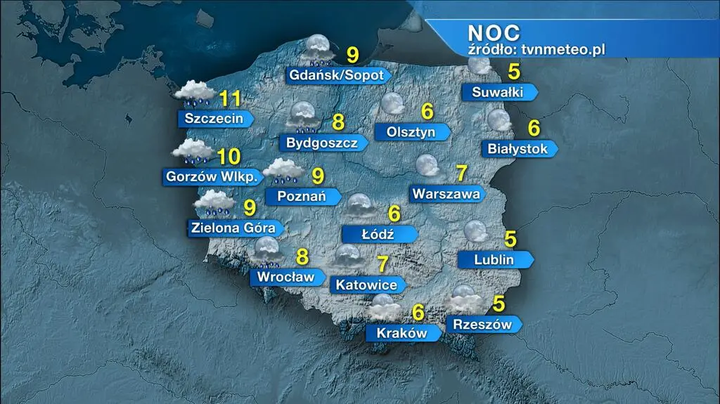 Na wschodzie w nocy będzie pogodnie. Od zachodu prognozowany jest jednak wzrost zachmurzenia do dużego i całkowitego ze słabymi opadami deszczu do pięciu litrów wody na metr kwadratowy. Temperatura minimalna wyniesie od 4-6 stopni Celsjusza na wschodzie Polski do 9-11 st. C na zachodzie. Wiatr okaże się południowo-wschodni, umiarkowany, w drugiej części nocy na zachodzie dość silny, porywisty.