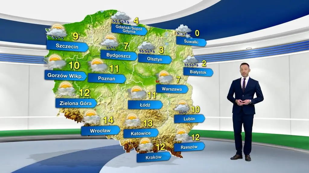 Dzień przyniesie duże zachmurzenie. W rejonie Podlasia i Mazur wystąpią opady deszczu ze śniegiem i deszczu, które lokalnie mogą być marznące. Na Pomorzu, Kujawach i Lubelszczyźnie oraz w niektórych miejscach na Mazowszu spadnie sam deszcz. W pozostałych regionach, gdzie nie powinno padać, pojawią się przejaśnienia i rozpogodzenia.