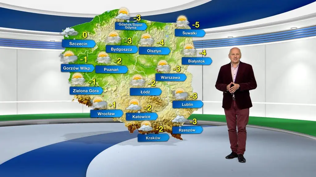 Noc zapowiada się pochmurno z przejaśnieniami i rozpogodzeniami. Na południu i południowym wschodzie kraju okresami będą pojawiać się opady śniegu do 3 centymetrów, a na Wybrzeżu i Pomorzu spadnie do 5 cm. Temperatura minimalna wyniesie od -11 i -10 stopni Celsjusza północnym wschodzie, przez -8 st. C w centrum, do -5 st. C na Podkarpaciu i Pomorzu Zachodnim. Wiatr będzie północno-wschodni, słaby i umiarkowany, na Wybrzeżu okresami dość silny.