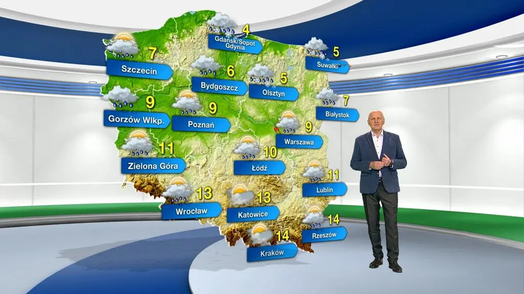 Dzień na północy kraju zapowiada się pochmurno z opadami deszczu, przejściowo również deszczu ze śniegiem. W pozostałych regionach zachmurzenie będzie duże z rozpogodzeniami, ale również przelotnie popada deszcz. Na termometrach zobaczymy maksymalnie od 4 st. C na Pomorzu Gdańskim do 14 st. C w Małopolsce i na Podkarpaciu. Powieje z kierunku zachodniego, umiarkowanie i dość silnie, w porywach do 50-70 km/h. W ciągu dnia wiatr od zachodu stopniowo będzie słabnąć.