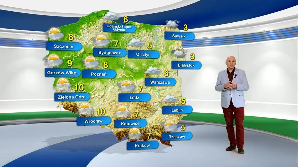 Dzień upłynie pod znakiem pochmurnej aury z większymi przejaśnieniami i rozpogodzeniami, zwłaszcza w zachodniej i południowej części kraju. Rano lokalnie będzie mglisto. Na termometrach zobaczymy maksymalnie od 3 st. C na Suwalszczyźnie, przez 7 st. C w środkowych regionach, do 10 st. C na Dolnym Śląsku i Ziemi Lubuskiej. Południowy i zachodni wiatr będzie słaby i umiarkowany.