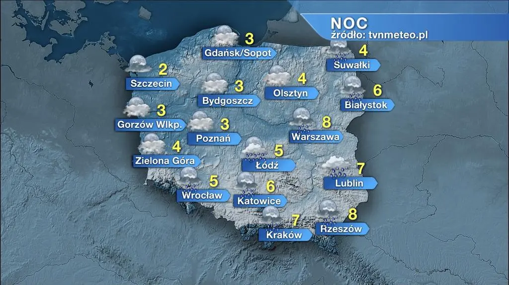 Nocą pojawi się umiarkowane i duże zachmurzenie. Na południu, wschodzie i w centrum kraju okresami może popadać deszcz do 5 litrów na metr kwadratowy. Na termometrach zobaczymy minimum od 2 stopni Celsjusza na Pomorzu Zachodnim, przez 5-6 st. C w centrum kraju, do 8 st. C na Mazowszu i Podkarpaciu. Wiatr z zachodu i południowego zachodu będzie słaby i umiarkowany. Jedynie na południowym wschodzie okresami może być dość silny - do 60 kilometrów na godzinę. W Karpatach porywy mogą sięgać 80-100 km/h.