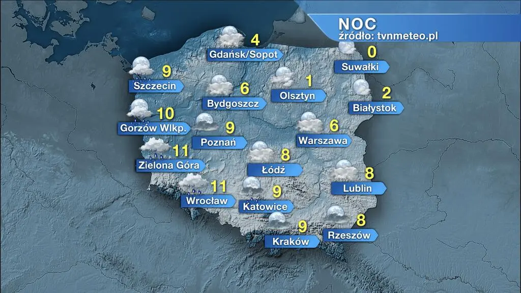 Pochmurno z przejaśnieniami. Temperatura minimalna wyniesie 9 st. C. Wiatr będzie wschodni, słaby i umiarkowany. Ciśnienie spada, o północy osiągnie 1008 hPa.