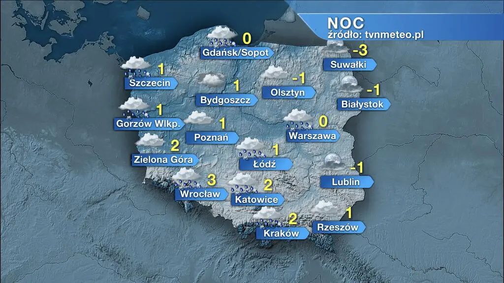 Zapowiada się pochmurna noc. Na Pomorzu oraz Śląsku, w Małopolsce, na Ziemi Łódzkiej i Mazowszu okresami wystąpią opady deszczu ze śniegiem do 5 litrów wody na metr kwadratowy oraz śniegu do 1-2 centymetrów. Temperatura minimalna wyniesie od -2/-3 stopnia Celsjusza na Suwalszczyźnie i Podlasiu, przez 0/1 st. C w centrum kraju, do 2/3 st. C na Śląsku. Wiatr będzie południowy i zachodni, słaby i umiarkowany.