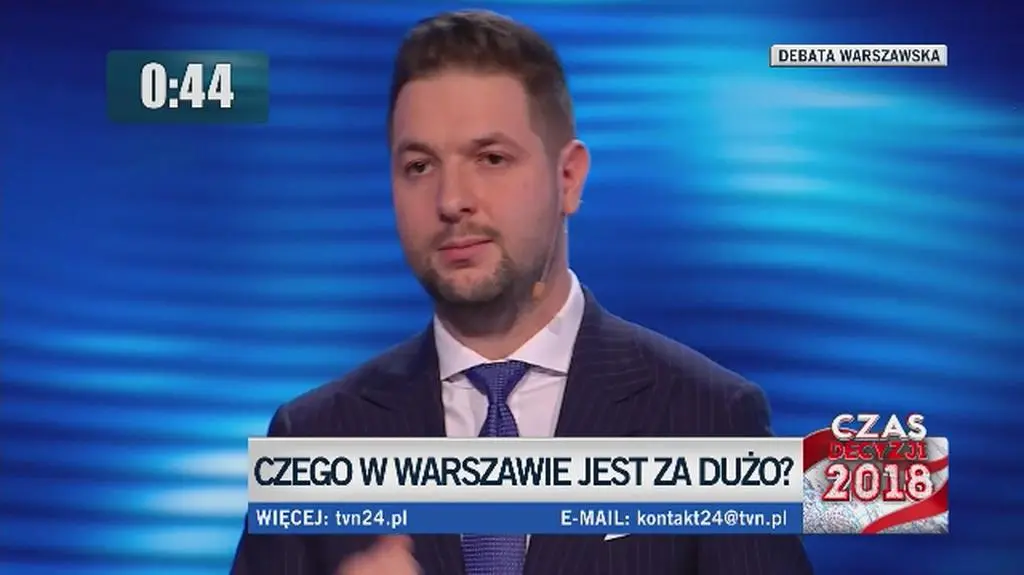 21.34 Patryk Jaki: Za mało jest żłobków i przedszkoli, świetlic i zajęć poza lekcyjnych. Za mało jest planów zagospodarowania, parków i miejsc zielonych. Za mało jest linii metra, obiektów sportowych, linii tramwajowych. Za mało w tej chwili jest dyskusji o sprawach merytorycznych, a za dużo o PiS-e, więc potrzebujemy wreszcie bezpartyjnego prezydenta.