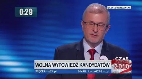 21.36 Krystyna Krzekotowska korzysta z prawa do riposty: poniosła mnie dusza obrońcy i chcę wziąć w obronę pana Jakiego. Pierwszy raz mamy coś fantastycznego - my kandydaci możemy rozmawiać i warszawiacy mogą nas widzieć.
