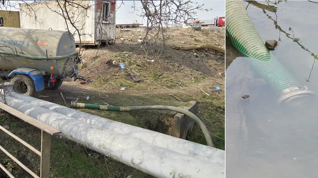 Zobacz szambiarkę, która wylewa coś do potoku: