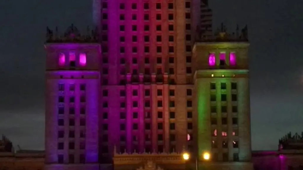 Kombinacji oświetlenia pałacu jest wiele, to komputer odmierza czas ich trwania. Zazwyczaj widzimy jednak jedną z nich. W dni powszednie elewacja pałacu świeci, jak zapewnia rzecznika, białą barwą zalewową. - Natomiast w weekend o każdej godzinie pełnej świecimy przez 15 minut kolorami tęczy - tłumaczy Dudziak.