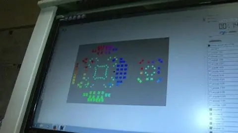 - Wyświetlające się na ekranie kwadraciki to rzut z góry rozlokowania poszczególnych reflektorów na pałacu. Większe prostokąty to reflektory zewnętrzne - takich mamy 72. Oświetlają elewację. Natomiast te mniejsze, czyli kropeczki, małe kółeczka to są reflektory mniejsze. One podświetlają wnęki: baszty czy taras widokowy na 30. piętrze. Tych jest 78 - wyjaśnia Dudziak.