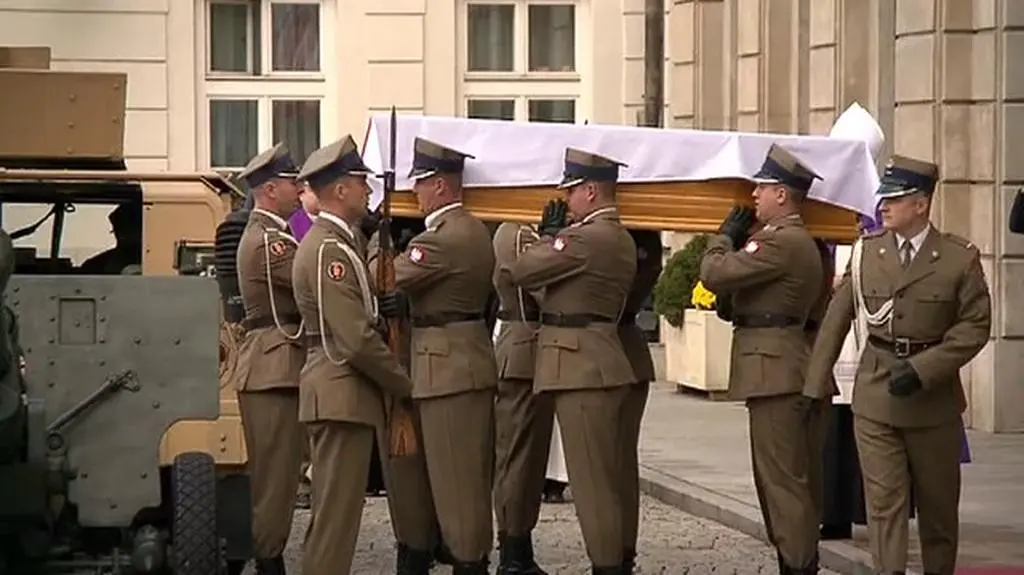 10:30 Orszak żałobny z trumną b. premiera wyruszył z Pałacu Prezydenckiego w kierunku warszawskiej Bazyliki Archikatedralnej. Trumna przewożona jest w asyście orszaku honorowego w skład którego wchodzi między innymi Kompania Reprezentacyjna Wojska Polskiego.