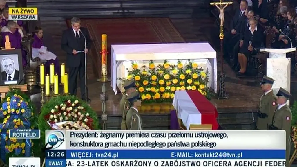 12:19 - Żegnamy premiera czasu przełomu ustrojowego, konstruktora gmachu niepodległego państwa polskiego mówił na zakończenie mszy żałobnej prezydent Bronisław Komorowski.
