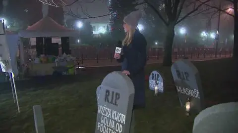 Nocna i przenikliwie zimna mgła tworzy scenerię do osobliwej instalacji. - Przed Sejmem powstał cmentarz wartości, które pogrzebał lub usiłuje pogrzebać obecny rząd - relacjonuje Justyna Kosela, reporterka TVN24. - Dalej stoi metalowy płot, na którym są przyczepione kwiatki, kartki z hasłami politycznymi, a nawet świąteczne ozdoby - dodaje.