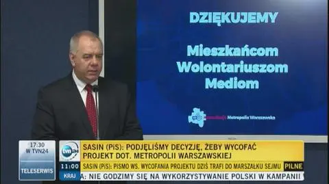 Sasin wyraził przekonanie, że prace nad projektem będą nadal trwały i efekt w postaci ustawy o metropolii warszawskiej "zostanie osiągnięty".