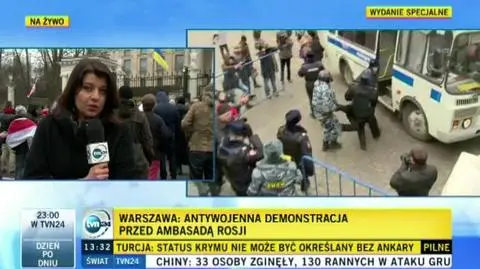 Natalia Ponczenko z komitetu organizacyjnego Euromajdan w Warszawie podkreśliła, że manifestacja pod ambasadą ma charakter pokojowy. - My nie jesteśmy Rosją, nie jesteśmy Putinem, by kogokolwiek atakować. To, co możemy zrobić, to w sposób pokojowy pokazać, że obywatele mojego narodu nigdy nie pogodzą się z tym, co Rosja robi na Ukrainie - powiedziała.Dodała, że zgromadzeni chcą użyć wszelkich pokojowych środków, aby zwracać się do ambasady rosyjskiej - a za jej pośrednictwem do rosyjskich władz - o to, aby kraj ten "przestał się wtrącać w wewnętrzne sprawy Ukrainy i aby skończyli tę wojnę, którą chcą teraz rozpoczynać".Jak powiedział po godz. 12.30 Marcinczak, ul. Belwederska jest całkowicie zablokowana. Autobusy linii 116, 166, 180, 503 kursowały ul. Spacerową - Goworka - pl. Uni Lubelskiej - al. Szucha.