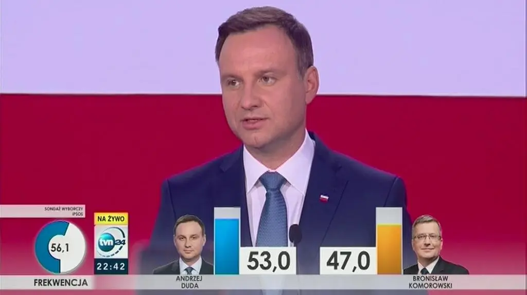 Jak wynika z sondażu exit poll, Andrzej Duda zwyciężył również w skali całego kraju, zdobywając 52 proc. głosów. Obecny prezydent Bronisław Komorowski zdobył 48-procentowe poparcie.