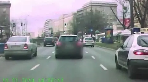 Radiowóz nie tylko nie zwalnia, ale też przejeżdża już nawet nie na pomarańczowym, ale po prostu na czerwonym.