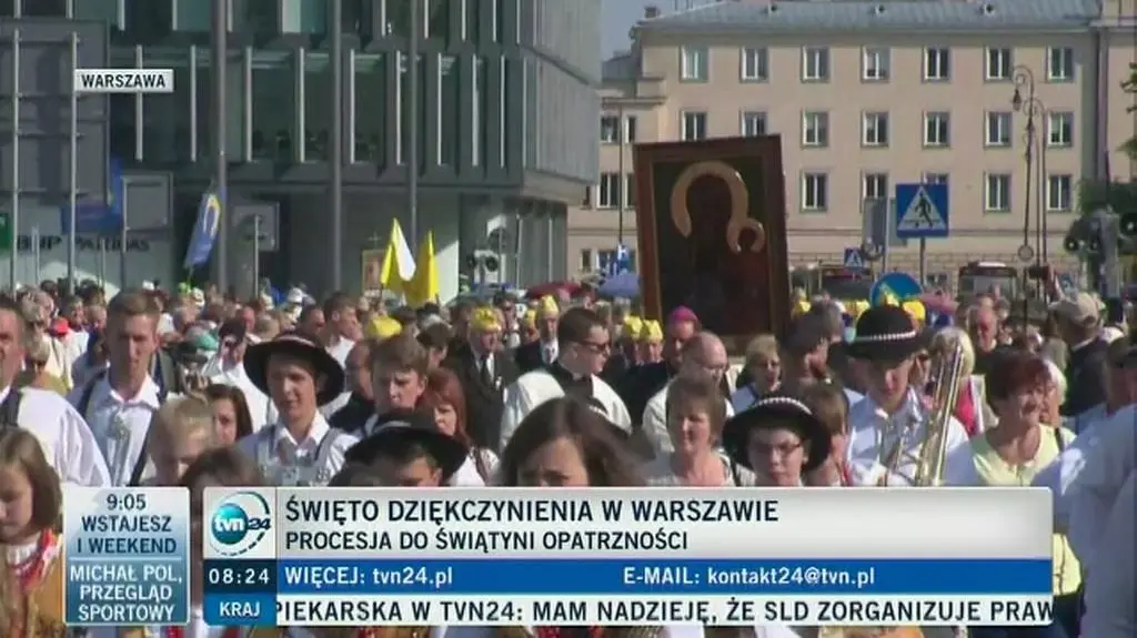 Procesja wyruszyła rano z pl. Piłsudskiego. Bp Markowski, który przywitał uczestników procesji, przypomniał, że VIII Święto Dziękczynienia związane jest z budową Świątyni Opatrzności Bożej. - Kolejnego roku dziękujemy Opatrzności za wielkie rzeczy, które dokonuje dla nas, dziękowaliśmy za beatyfikację księdza Jerzego, za beatyfikację Jana Pawła II, dziękowaliśmy również za kanonizację Jana Pawła II, dzisiejszą myślą przewodnią Święta Dziękczynienia jest wielkie dziękczynienie za nawiedzenie ikony jasnogórskiej, jaka dokonała się w naszych parafiach na terenie archidiecezji warszawskiej na przestrzeni minionego roku - zaznaczył.