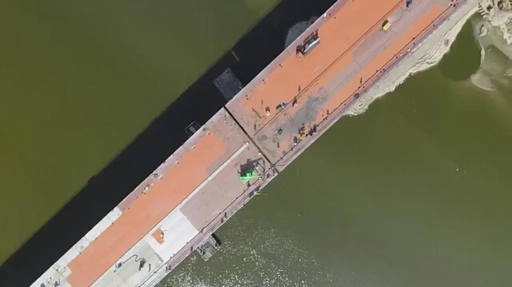Wcześniej, aby zrobić miejsce dla wypychanych fragmentów, most został przecięty w połowie i wykonawcy remontu odcięli ok. 30 metrów starego mostu, po 15 metrów w każdą stronę. Niepotrzebne elementy są cięte na mniejsze kawałki, podawane na barkę i wywożone.