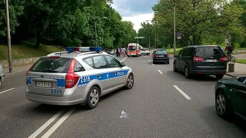 Skuter leży na boku, samochód osobowy stoi w poprzek drogi. - Kierowca skutera stracił przytomność, ale odzyskał ją. Uskarżał się na bóle głowy i pleców, więc pogotowie go zabrało do szpitala - mówi Węgrzynowicz.