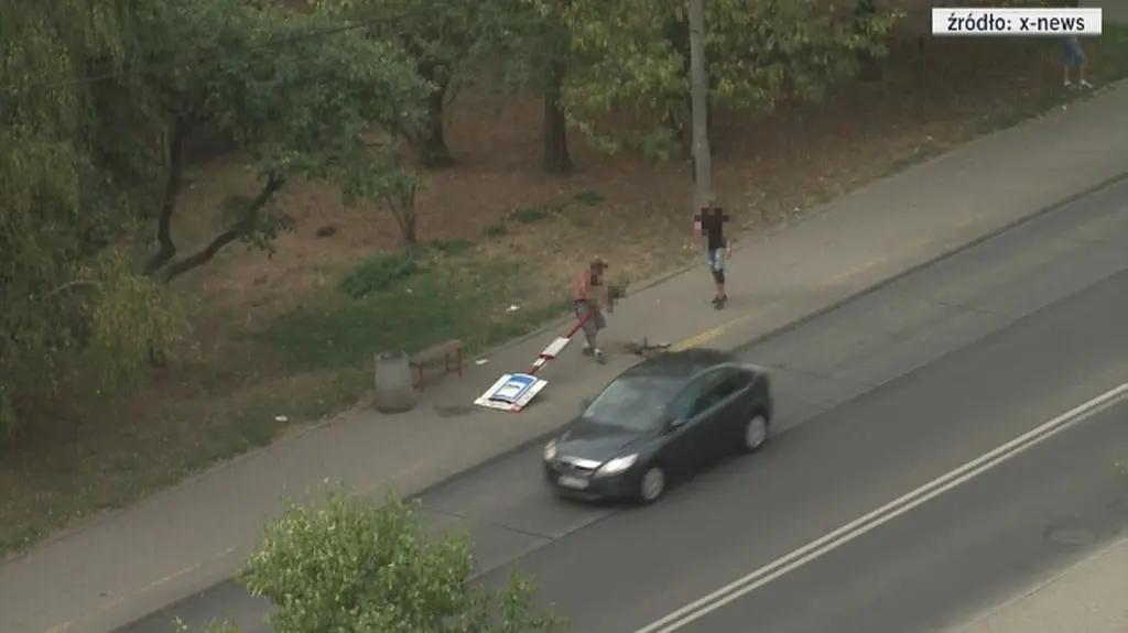Na nagraniu widać, jak mężczyzna bez koszulki podnosi wyrwany wcześniej z chodnika słup przystankowy. Potem ciągnie go kilkanaście metrów i rzuca na pobliski trawnik. Po chwili taki sam los spotyka górną część, ze znakiem zawierającym numery autobusów, który zsunął się ze słupa. Cały czas "kibicował" mu zataczający się kompan.
