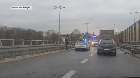 Chevrolet uderzył w bariery po lewej stronie jezdni, na zjeździe w kierunku Wilanowa. Auto ma mocno uszkodzony przód. Pod wpływem uderzenia, obróciło się tyłem do kierunku jazdy.