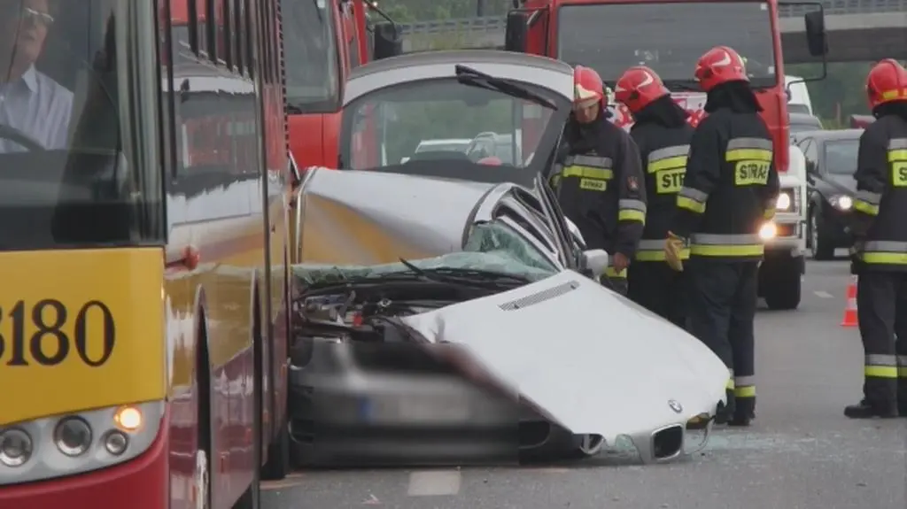 - Według świadków, autobus miejski 709 stał na przystanku, na wysokości Wyścigów. Kierowca BMW chciał go ominąć i zmienił pas na środkowy. Wtedy uderzył w niego autobus linii 331 - relacjonuje Lech Marcinczak, reporter tvnwarszawa.pl. - W wyniku zderzenia osobówka wpadła pod stojący autobus - dodaje.