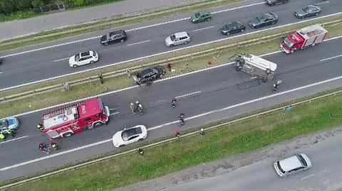 Do kolizji doszło około godziny 11 na Kolejowej w Łomiankach (w ciągu drogi krajowej nr 7), około 200 metrów za skrzyżowaniem z Wiślaną. - Zderzyły się trzy samochody, jeden dostawczy, który leży na boku i dwa osobowe: porsche i renault - podawał reporter tvnwarszawa.pl Lech Marcinczak.Dodał, ze nikomu nic się nie stało, jednak trasa była zablokowana. - Ruch odbywa się lokalną drogą. Tworzą się korki - ostrzegał.Na miejscu pracowały straż pożarna oraz policja. - Ustalamy okoliczności zdarzenia, kierowcy byli trzeźwi - mówiła Marta Dymek z policji w Starych Babicach.