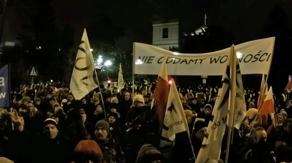 Wcześniej przed Sejmem odbywał się protest Komitetu Obrony Demokracji. Brali w nim udział także m.in. politycy PO, Nowoczesnej, Inicjatywy Polskiej. Skandowali hasła "Wolne media, wolna Polska". Uczestnicy odśpiewali też hymn. Przekonują, że przyszli na Wiejską w obronie demokracji.
