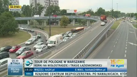 15.25 - Wisłostrada stoi, kierowcy wyłączają silniki, pytają co się stało. W olbrzymim korku ludzie zapominają o wielkim święcie kolarskim - relacjonuje Lech Marcinczak, reporter tvnwarszawa.pl.