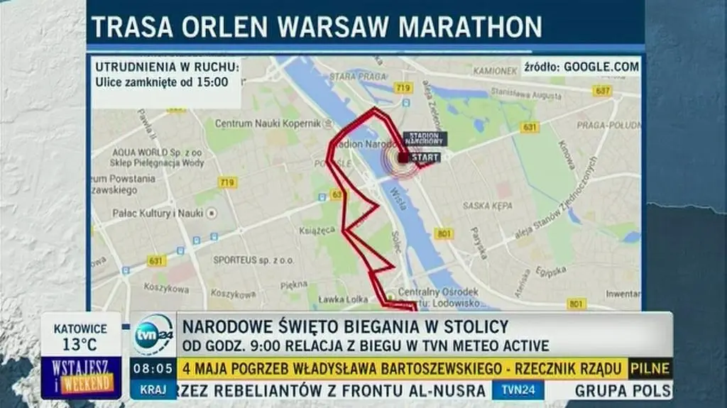 8.46 - Jak podaje ZTM, wyłączono z ruchu kolejne ulice na trasie biegu: most Świętokrzyski, Wybrzeże Kościuszkowskie (jezdnia zachodnia), Sanguszki, Konwiktorska, Bonifraterska, Miodowa, Krakowskie Przedmieście, Nowy Świat (na odc. Krakowskie Przedmieście – Świętokrzyska), Świętokrzyska (na odc. Nowy Świat – Kopernika), Kopernika, Tamka, Dobra (na odc. Tamka – Solec), Solec (na odc. Dobra – Ludna), Ludna (na odc. Solec – Czerniakowska), Czerniakowska (na odc. Ludna – Górnośląska), Górnośląska, Rozbrat, Myśliwiecka (na odc. rondo Sedlaczka – Szwoleżerów), Szwoleżerów, Czerniakowska (1-2 pasy na odc. Szwoleżerów – Gagarina), Gagarina, Spacerowa, Goworka, Puławska (jezdnia wschodnia na odc. Goworka – Bukowińska), Bukowińska, Rolna (jezdnia wschodnia), Wałbrzyska (na odc. Rolna – Kurpińskiego), al. KEN (jezdnia wschodnia na odc. Rolna – Gandhi) – Gandhi (jezdnia południowa na odc. al. KEN – Rosoła), Rosoła, Relaksowa i Kabacka.