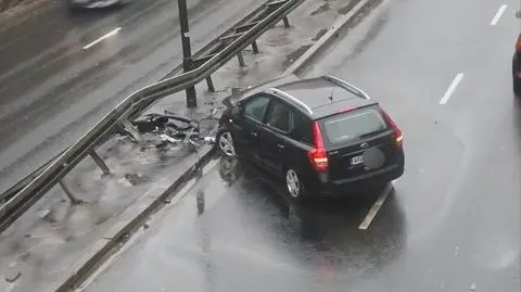 - Kia stoi w poprzek lewego pasa ruchu. Na jezdni są odłamki karoserii i płyny, które wyciekły z samochodu - relacjonował Artur Węgrzynowicz, reporter tvnwarszawa.pl. Dodał też, że samochód uszkodził barierki oddzielające przeciwległe pasy jezdni i pobliską latarnię.