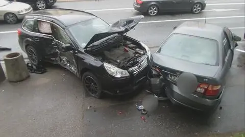 W kierunku centrum, przed ulicą Młynarską doszło do zderzenia dwóch samochodów. Subaru i Suzuki. Jak poinformował nasz reporter, po zderzeniu się tych dwóch aut, trzeci pojazd - nissan, również został uszkodzony.