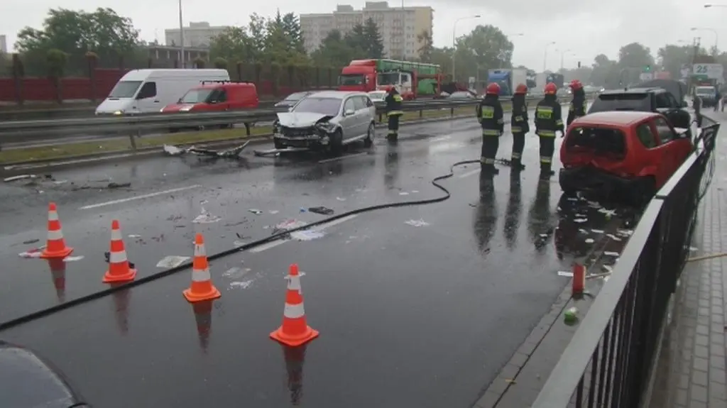 Wypadek trzech samochodów na Wale Miedzeszyńskim. Ratownicy pogotowia reanimowali ciężko ranną kobietę, która jechała fiatem. Ulica była całkowicie zablokowana w kierunku Wawra.